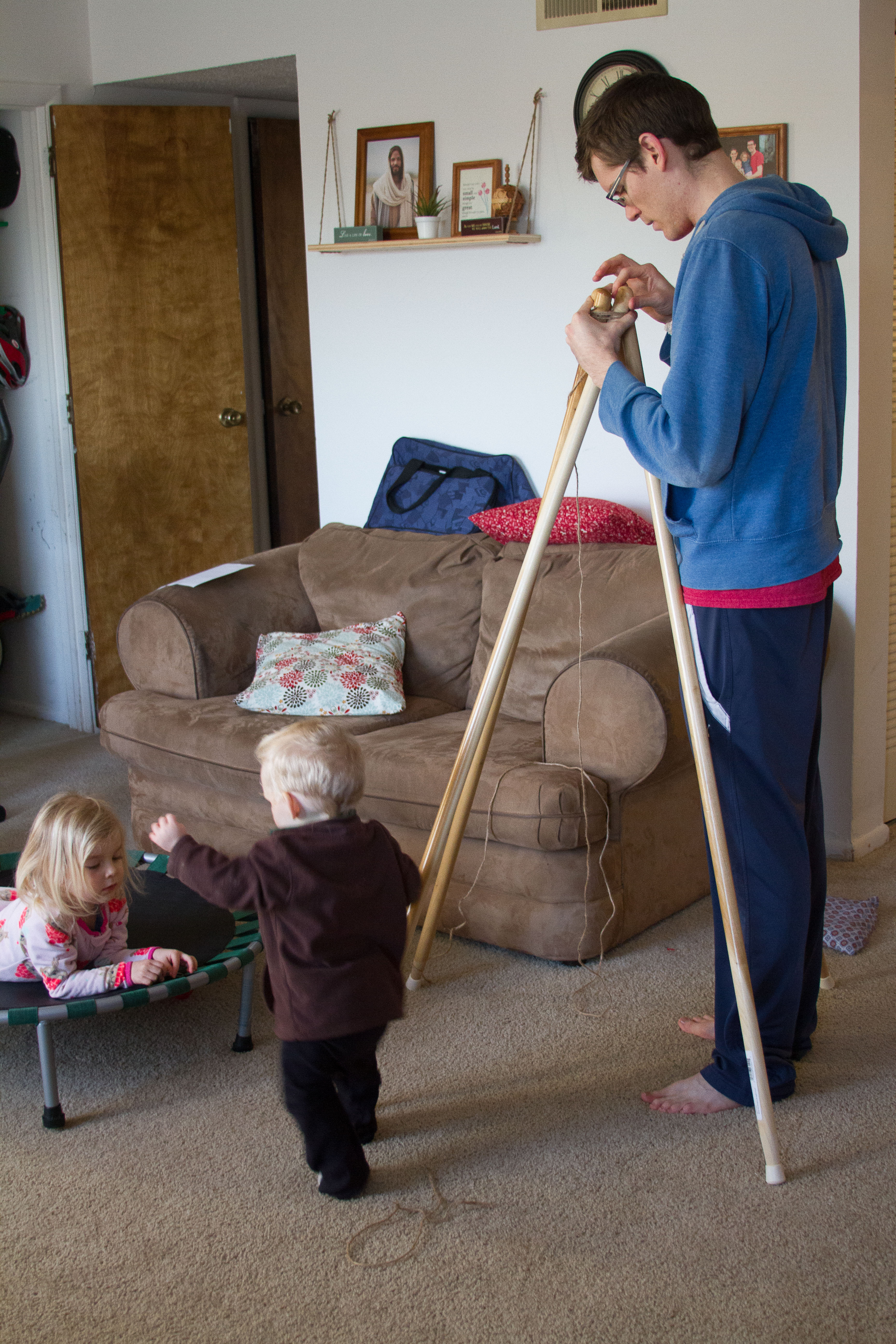 The kids figured out that our teepee makes a fantastic swinging jungle gym. It worked as long as I was holding onto it to keep everything steady. Emily hopped on while I was talking with a friend and the teepee collapsed entirely, leaving Emily, Nathan, and our friend all sobbing uncontrollably at the loss of their new toy. The next day Andrew took to fixing and strengthening the set up so it would be available for more winter entertainment.